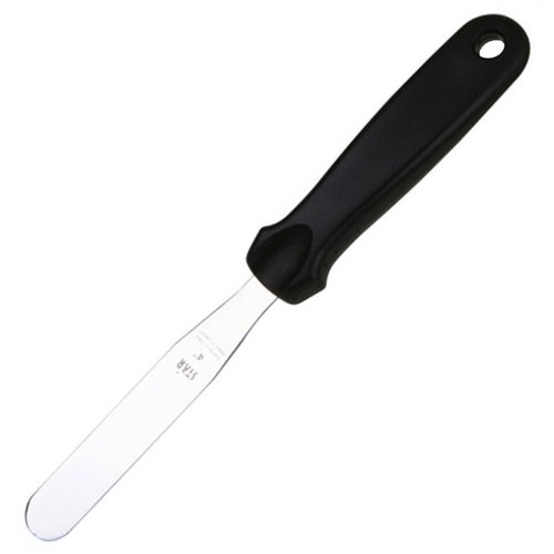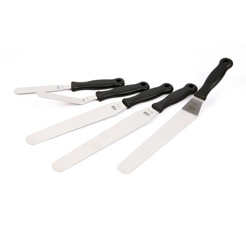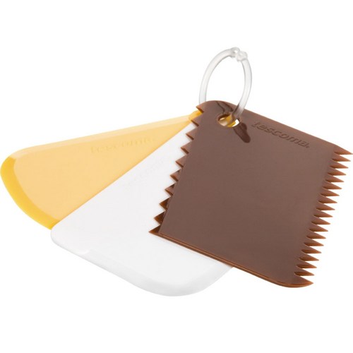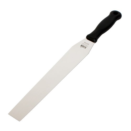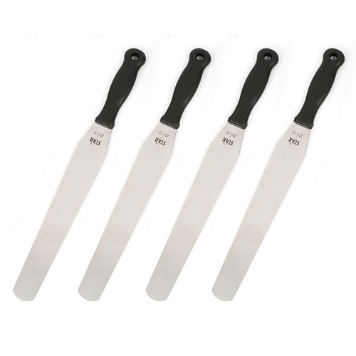 스크레이퍼 넓고 평평한 형태. 주로 플라스틱 또는 스테인리스 재질. 케이크 시트 표면 정리, 빵 반죽 정리, 넓은 면적 아이싱 등에 용이. 섬세한 작업에는 부적합. 케이크 시트 정리, 대량 생산, 넓은 면적 아이싱